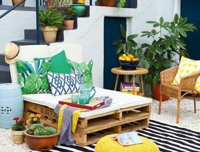 Amenagement jardin en couleurs vibrantes et rayonnantes avec tapis aux rayures noires et blanches