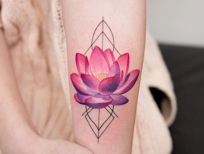 02 adorable idée de dessin sur la peau tatouage coloré fleur et motif géométrique signification fleur de lotus symbole tatouage fleur de lotus
