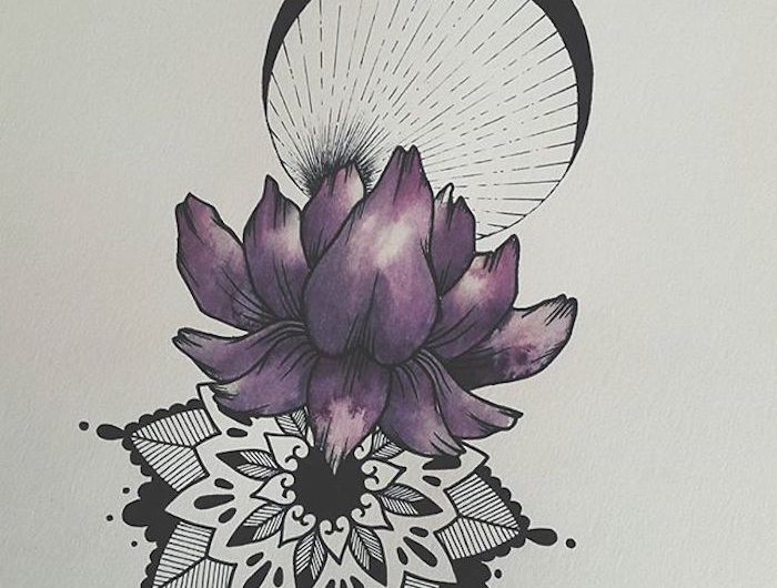 Coloré symbole tatouage fleur de lotus tatouage idée inspiratrice dessin de fleur et la lune avec une tache d ancre au dessus