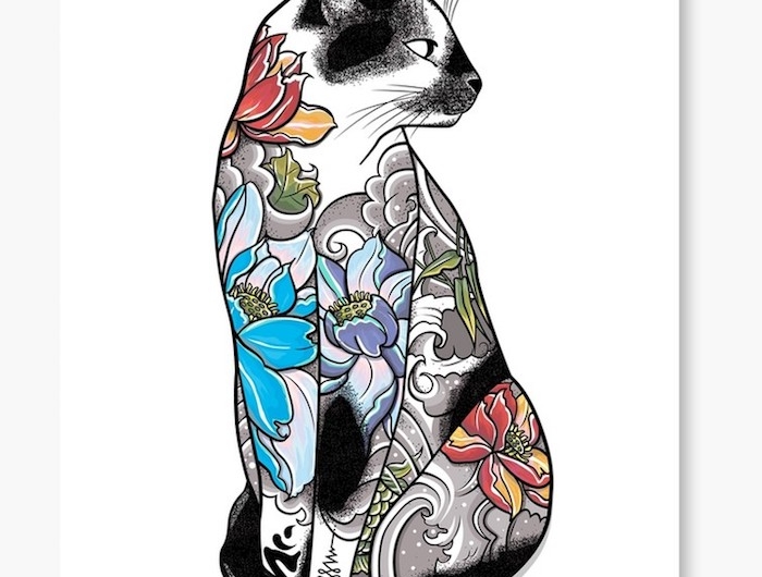 Dessin de chat avec tatouages de fleurs adorable idée tatouage epaule tatouage symbolique fleur de lotus
