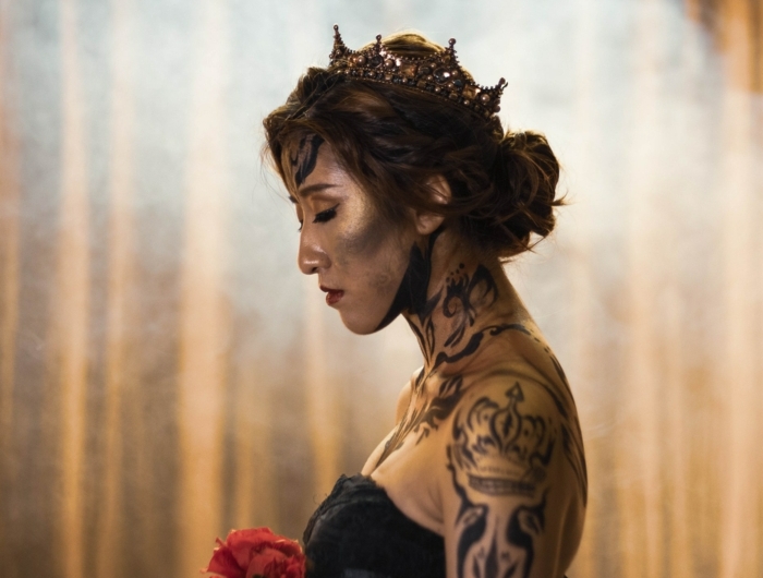Chouette tatouage belle femme nouvelle tendance tatouage abstrait tatouage bras moderne style original couronne tatouage sur l épaule femme robe de mariage noire