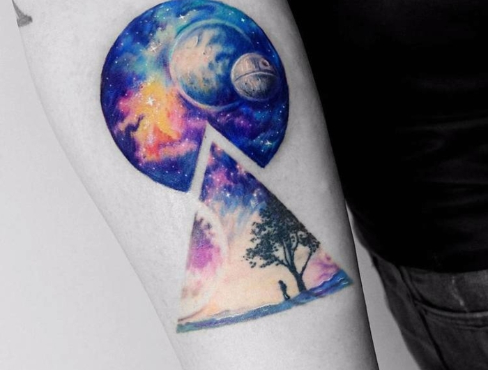 Coloré tatouage piramide avec dessin d arbre dans nouveau planet cercle qui montre le cosmus abstrait tatouage des planets non existantes
