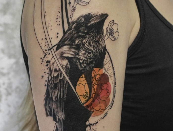Femme épaule tatouage corbeau noir fleurs original dessin modele de tatouage dessin stylisé technique dessin sur la peau permanente
