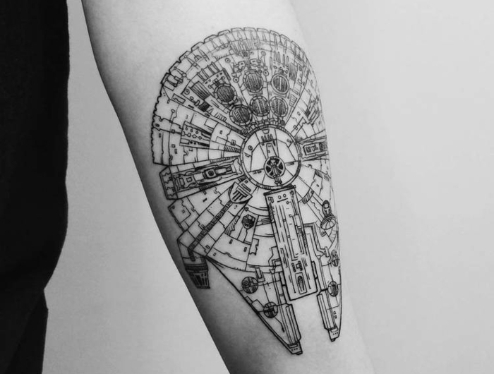 Le falcon tatouage geek dessin graphique de space ship tatouage infini dessin stylisé dessin réalisé en injectant de l’encre dans la peau millenial falcon se tatouer star wars dessin