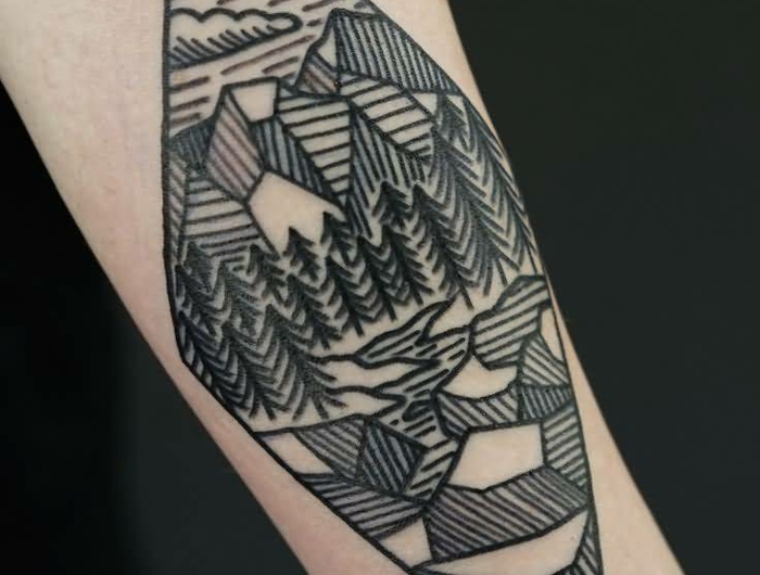 Montagnes graphiques chic tatouage bras modele de tatouage minimaliste dessin tatouage femme design dessin dans forme de diamond paysage de lignes droites