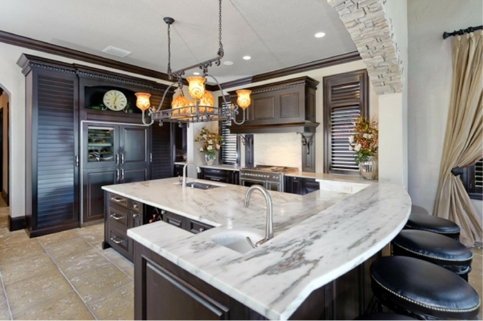 Tabourets de bar en cuir design de cuisine country ilot en marbre forme ondulante électroménager moderne