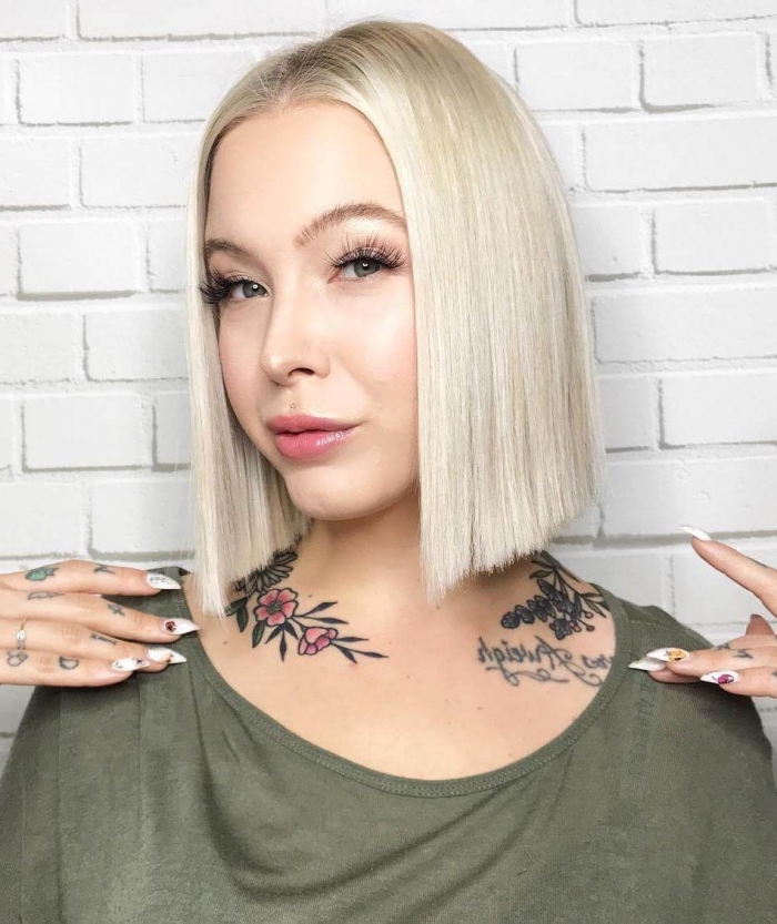 carré court blond avec frange longue de côté, idée coiffure cheveux courts et lisses en dégradé, maquillage lèvre rose