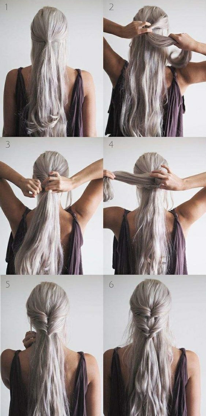 Juste au-dessus de l’élastique, faites un trou avec vos doigts et passez la queue-de-cheval dedans (un « topsy tail »).