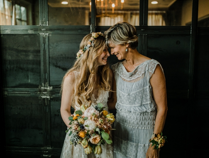 Magnifique photo de mariage la mariée et sa mere robes bohèmes en dentelle cool idée comment s habiller robe longue ete robe bohème chic dentelle bouquet pivoines