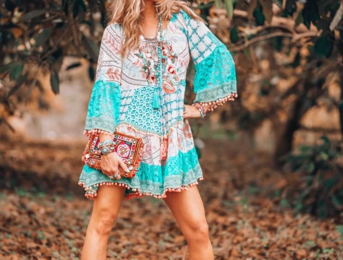 Sac a main hippie manche longue robe courte bohème idée robe courte coloré boheme belle robe hippie chic le style à choisir champetre style