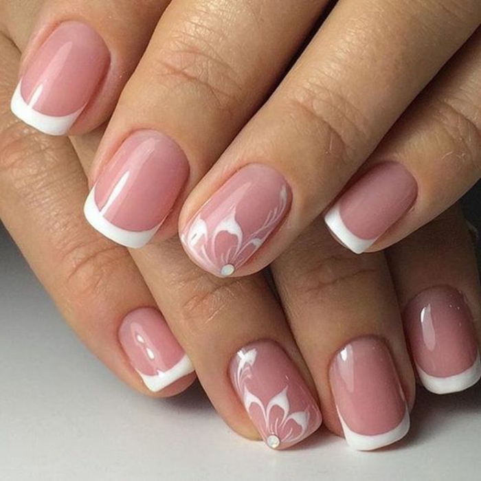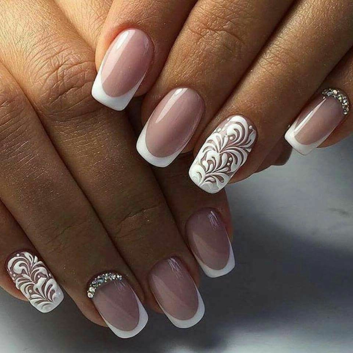 Les touches de Nail Art : Un ou deux strass sur l’annulaire, un dégradé de paillettes discrètes, un petit motif rappelant la dentelle de votre robe… Tout est possible.