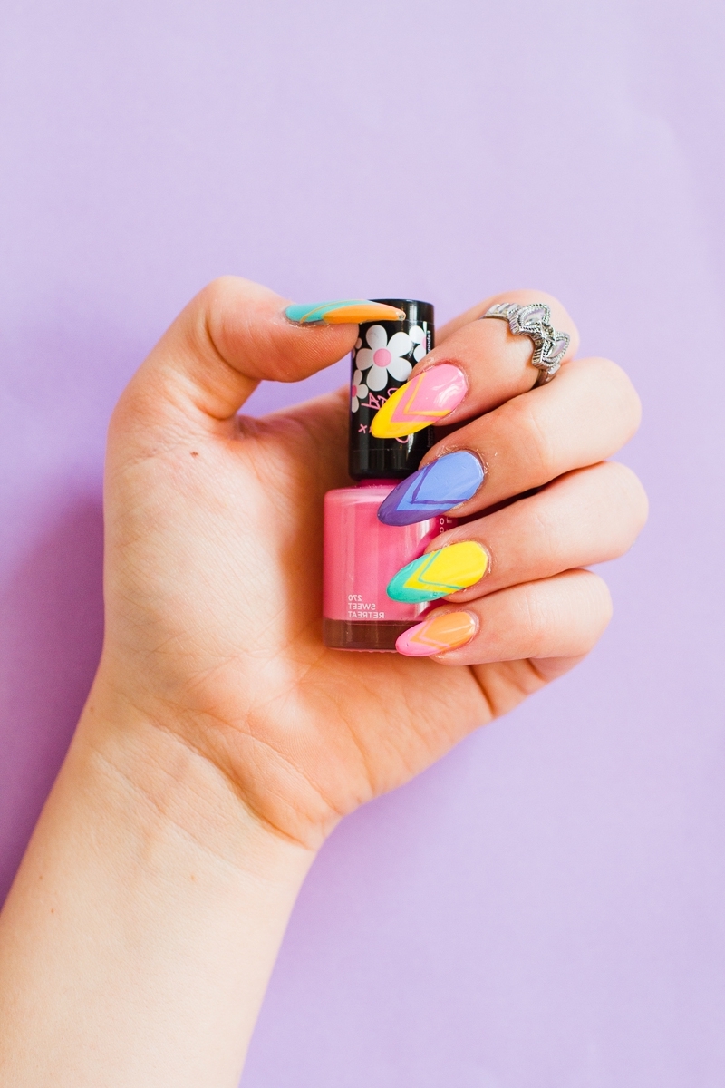 Cela signifie qu’au bout de deux semaines, une démarcation apparaît à la base de l’ongle. L’astuce pour camoufler la repousse sur une manucure multicolore ? Créez un design en