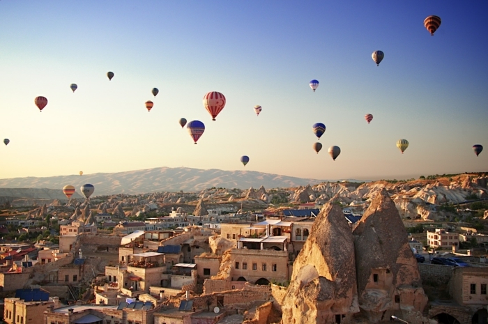 Sunrise in Cappadocia, Turkey, with balloons and typical fairy chimney